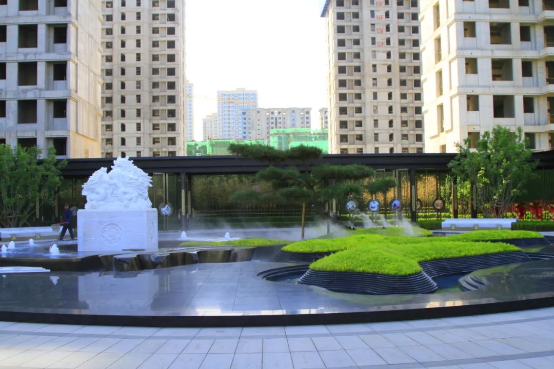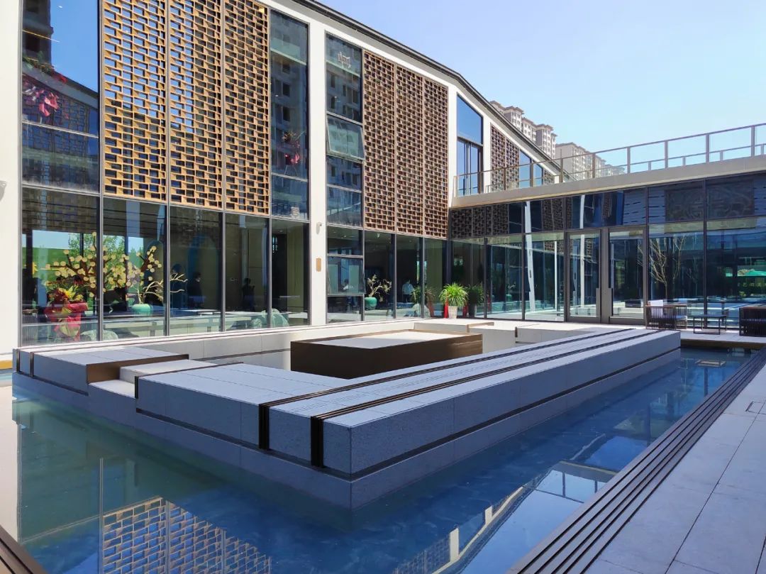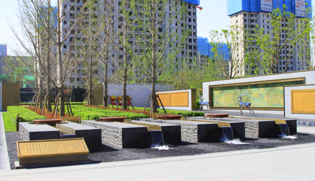 坐落在歷史景觀長軸與和軸的十字交叉點,水景以黑金砂鋪設(shè),呈現(xiàn)出“和”字樣式,池底為景泰藍(lán)石材,與周邊不銹鋼流水缽、漢白玉玉璽、造型迎客松等連成一體;從高空俯瞰看,它像是印章一樣印在我們國賓府的中心,寓意國賓府業(yè)主家和萬事興。