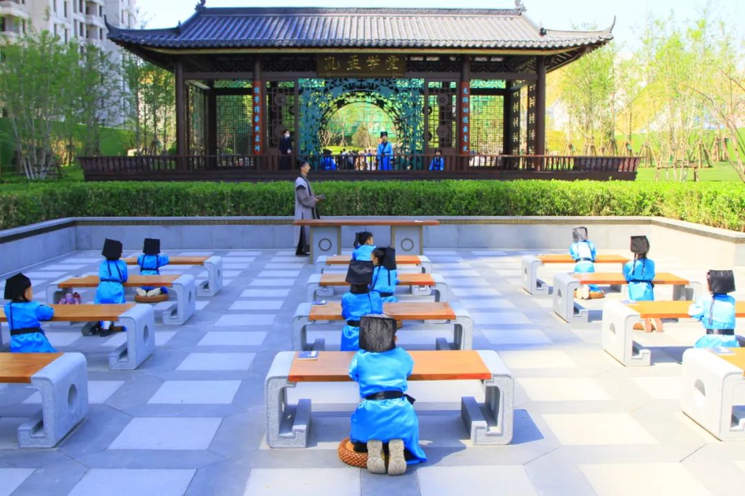 踏入學(xué)堂走到書案,映入眼簾是勸學(xué)和中庸的書卷雕塑,隔岸可以看到孔孟學(xué)堂亭,整個氛圍猶如“孔子講學(xué)”的場景。表達(dá)了西建國賓府對小業(yè)主們長大成龍成鳳的美好愿景。