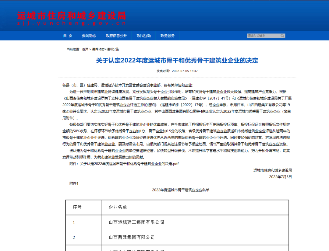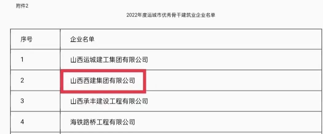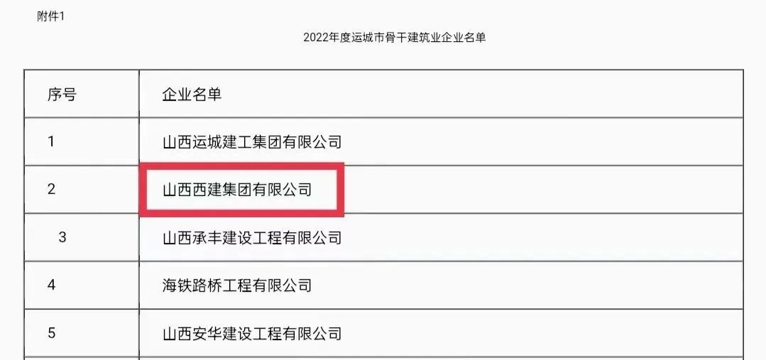 近日,從運城市住房和城鄉建設局傳來喜訊,山西西建集團有限公司憑借雄厚的實力和突出的業績,一舉斬獲“2022年度運城市骨干建筑業企業”和“2022年度運城市優秀骨干建筑業企業”雙重稱號。
